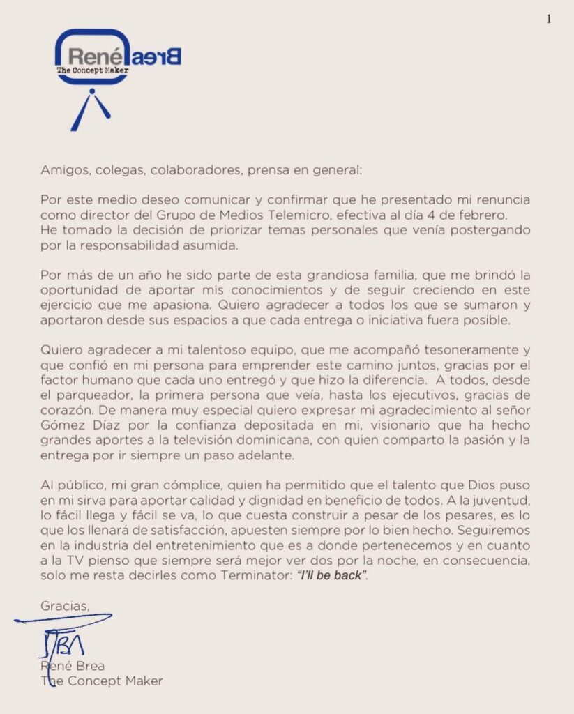 «Por este medio deseo comunicar y confirmar que he presentado mi renuncia como director del Grupo de Medios Telemicro, efectiva al día 4 de febrero. He tomado la decisión de priorizar temas personales que venia postergando por la responsabilidad asumida», señaló.